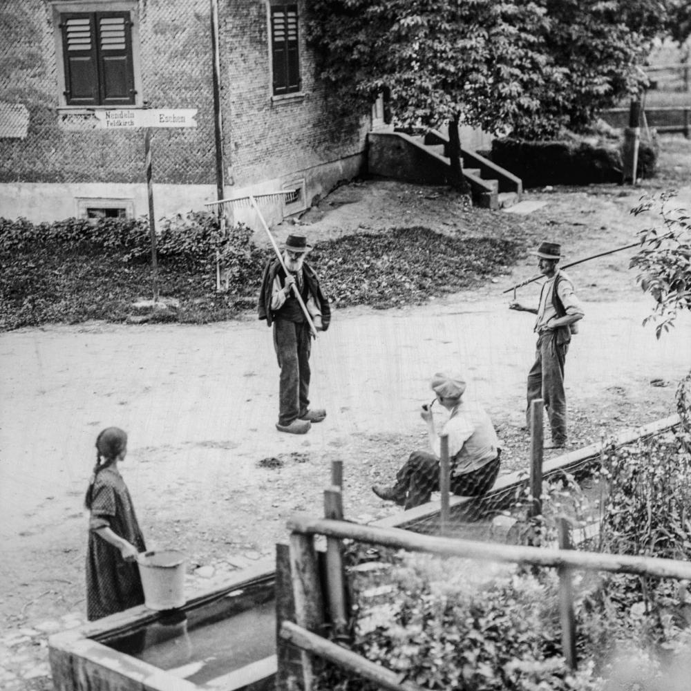 Im Vordergrund: v.l.n.r. Anna Wohlwend am Brunnen mit Kübel (1911–1997), Martin Matt mit Rechen, Altkassier (1848–1927), sitzend Sepp Nagel (1886–1965), Alfons Matt (1889–1981). Der Brunnen stand am Gartenzaun von Josef Wohlwend (1872–1925) Nr. 57. Im Hintergrund Haus Josef Kieber, Gänsenbach 59, «Simma-Sepp», Abbruch 1971, Der Beiname «Simma» oder «Sima» stammt von Simon ab.