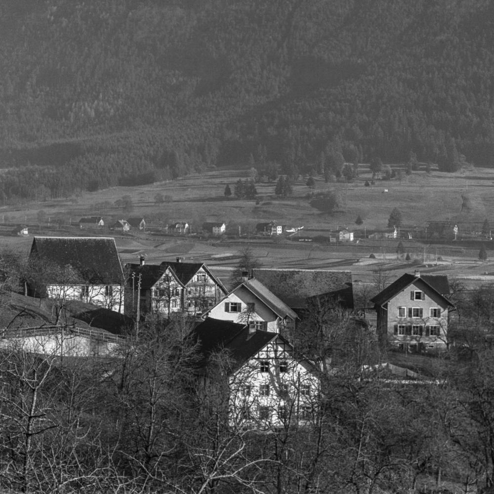 Häuser links: Torkel, Ambros Kaiser und «Balleschmied» Alfons Marxer. Mitte: Haus Nr. 71, Luis Matt, «Schlossers» und «Irle Hansa». Rechts: Haus Wenzel Öhri. Vorne: Haus Nr. 72, Georg und Philipp Kieber (Simma-Sepp).