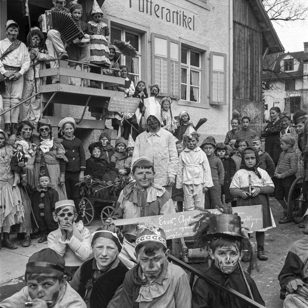 Fasnachtsgruppe vor der Bäckerei Ritter (Spitzname des Inhabers: Güg)