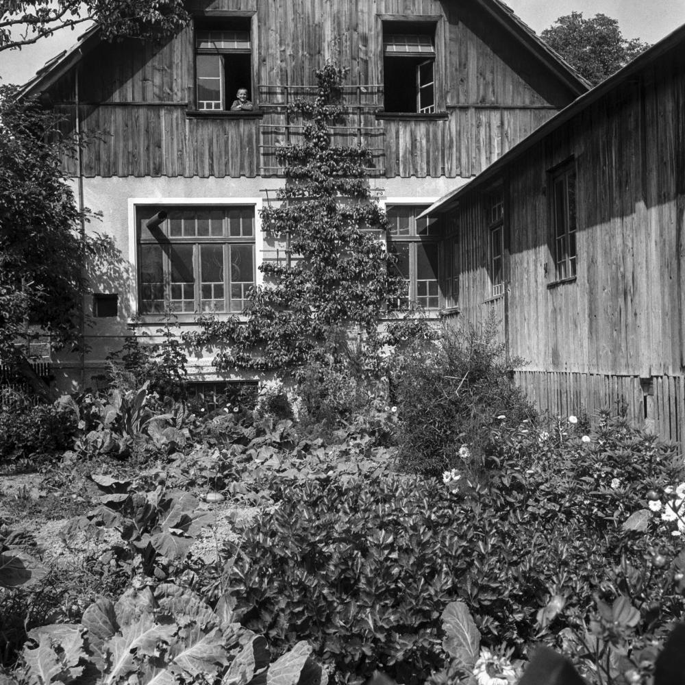 Die 1918 erbaute Schreierei von Eugen Meier (1889–1953). Oben schaut sein Sohn Wido (1927–1994) aus dem Fenster. Auf der Südseite ist der Gemüse- und Blumengarten der Mutter Josephine, geb. Ritter (1893–1973), angelegt, an der Hauswand wächst ein Spalierobstbaum. Das Schriner-Meier-Huus Nr. 66alt/76neu wurde 1969 abgerissen, nachdem Artur Meier daneben 1966 sein neues Wohnhaus (heute Haus-Nr. 119) gebaut hatte. Die Schreinerei wurde im Juni 2012 von Wolfgang Meier abgebrochen, bevor er das MFH baute.