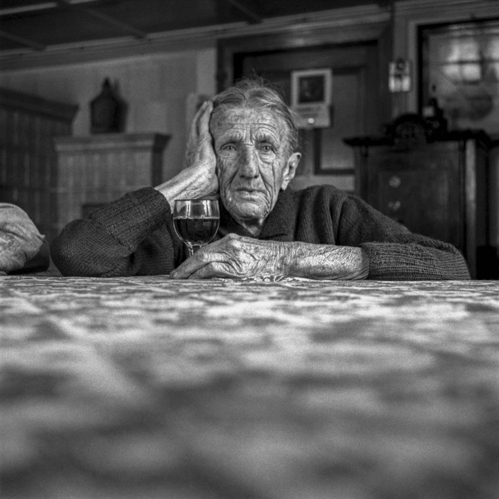In der Stube, nach der Arbeit bei einem Glas Wein.