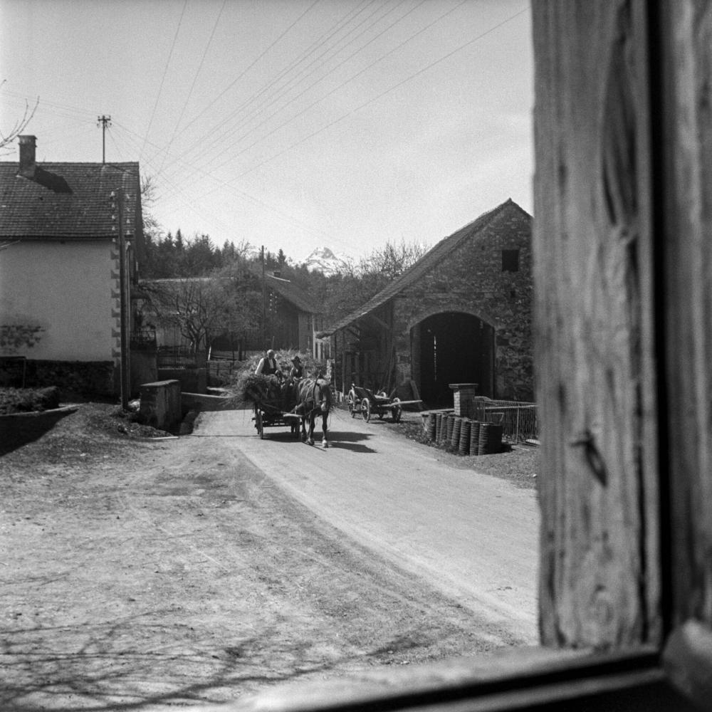 Wilhelm Fehr, «dr dick Fehr» (1860–1935), und Sebastian Büchel, «Böschile-Bascha» (1891–1967), auf dem «Streuefuder» bei der Zoschg (heute Zuschg, Gebäude rechts) auf dem Weg zur österreichischen Grenze, links hinten das Kirschbaumer Haus, vorne links das Walser Haus.