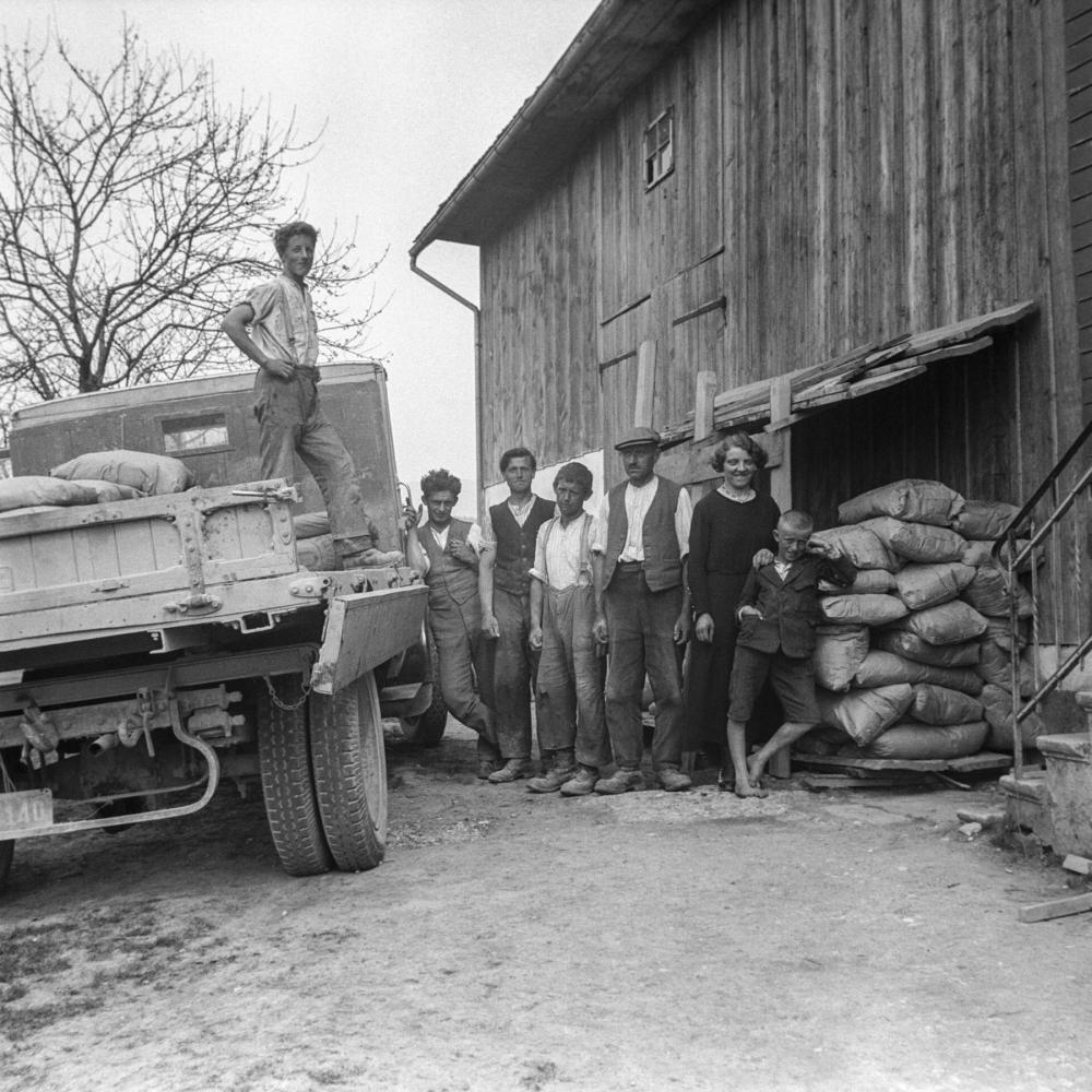 Lastwagen mit Andreas Ritter (1905–1979), der 2.v.l, mit Familie Meier (Sägerei), Schaanwald 26, «Sunnawürtle»: Karl Meier (1913–2005), Wilhelm Marxer, «s’Wilhelmle», diente als Knecht, Vater Thomas Meier (1875–1948), ganz rechts Franz Meier (1921–2015).