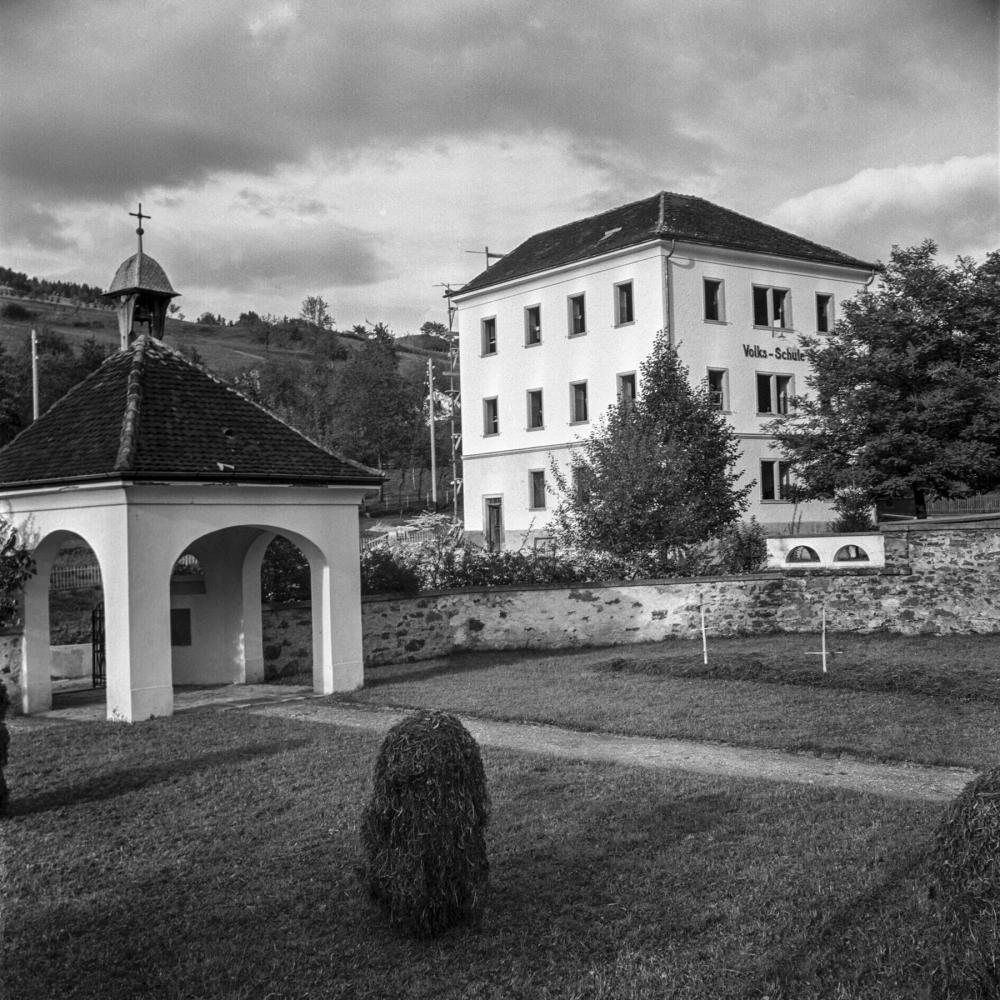Neuer Friedhof nach Fertigstellung. Dieser wurde 1922 erbaut, der Bauleiter war Anton Büchel. Im Hintergrund das alte Schulhaus (Bau 1899) nach der Renovierung 1936, welches 1980 abgebrochen wurde.